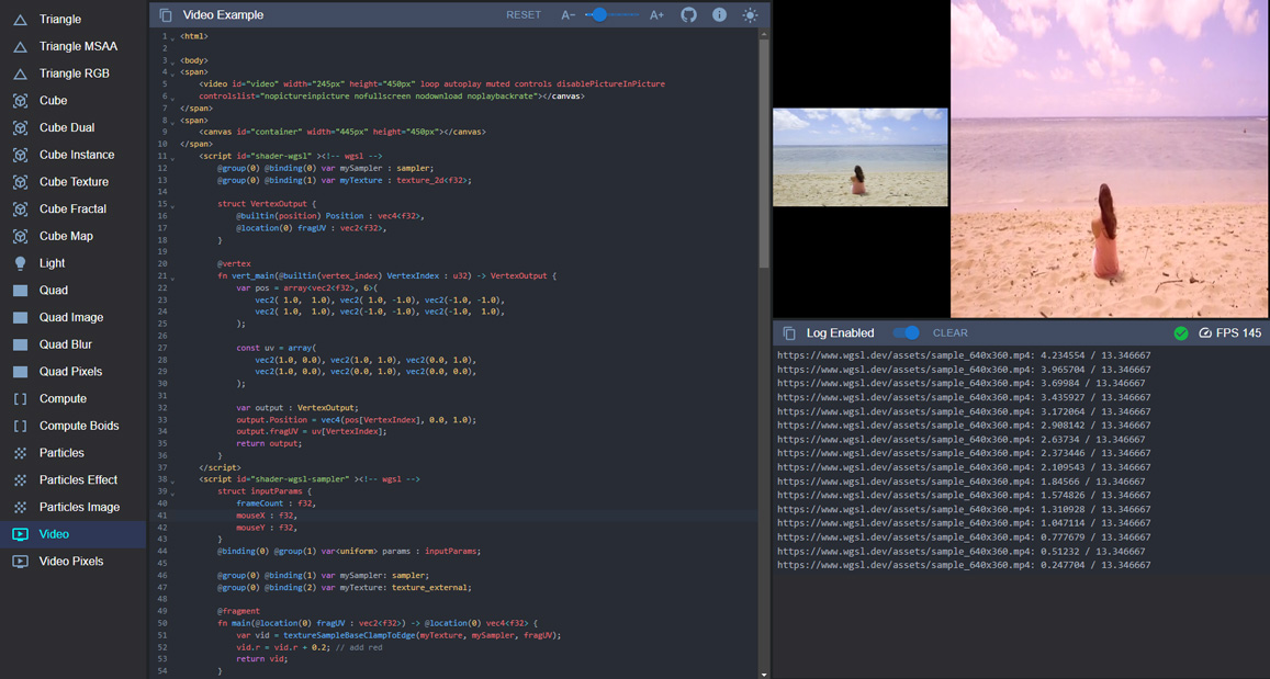 WebGPU Live Demo Editor Live code editor with custom made WebGPU examples. Built with Vercel, Node, React, and WebGPU API. Now live at WGSL.dev with technical details on Github page.